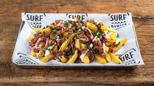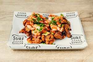 Frytki, Szarpana wieprzowina, piklowana cebula, cheddar, sriracha, mayo, sos BBQ, szczypiorek
