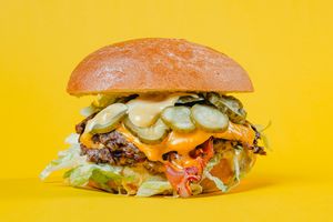 kotlet roślinny Beyond, cheddar Violife, sałata lodowa, czerwona cebula, pomidor, ogórek kiszony, wegańskie sosy: majonez, BBQ, wegańska brioche.