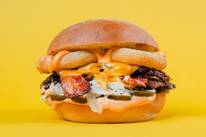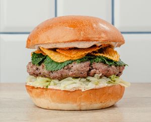 2 x wołowina smash, 2 x bekon, 2 x cheddar, krążki cebulowe, jalapeno, cebula, sriracha mayo