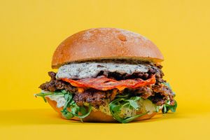 kotlet roślinny Beyond, cheddar Violife, krążki cebulowe, grillowana cebula, rukola, wegański majonez truflowy, wegańska brioche.